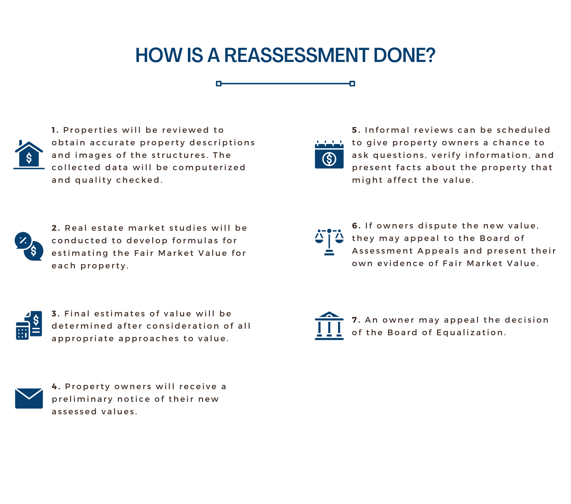 Remember, a reassessment establishes and addresses value, not taxes. Reassessments are important because tax revenue is based on the assessed value of all properties.
